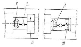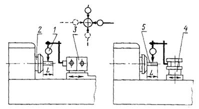 На неподвижной части станка укрепляют индикатор 1 так, чтобы его измерительный наконечник касался шарика 3, вставленного в центровое отверстие короткой оправки 4 или торца короткой оправки 5, установленных в калиброванное отверстие шпинделя 2. Шпиндель приводят во вращение. Отклонение определяют как наибольшую величину показаний индикатора. |