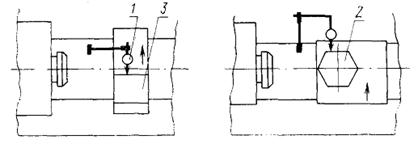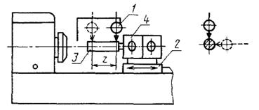 Индикатор 1 укрепляют в шпинделе 2 так, чтобы его измерительный наконечник был перпендикулярен в точке касания боковой грани револьверной головки 3 с вертикальной осью вращения (в рабочем положении головки) или торцовой поверхности головки 4 с горизонтальной осью вращения. Шпиндель с индикатором поворачивают на 180°. Отклонение определяют как алгебраическую разность показаний индикатора. В револьверных головках с вертикальной осью вращения проверке подвергают все боковые грани. |