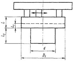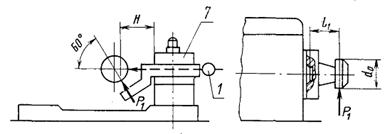 На шпинделе 4 станка жестко закрепляют оправку 5, основные размеры которой даны в табл. 1. При проверке с поперечным суппортом 7 в левом пазу его резцедержки, а при проверке с револьверной головкой 6 в жесткой стойке, являющейся принадлежностью головки, или в отверстии самой головки (если стойка не предусмотрена конструкцией, например головка с горизонтальной осью вращения) закрепляют устройства для создания нагружающих сил Р1 и P2. Для измерения сил используют рабочие динамометры. Перед каждым испытанием соответственно поперечному суппорту или револьверной головке сообщают перемещение с последующей установкой (движением к шпинделю) в заданное положение, а шпинделю - поворот. При проверке с револьверной головкой последнюю закрепляют. Между оправкой, закрепленной на шпинделе, и поперечным суппортом и затем между оправкой и револьверной головкой создаются плавно возрастающие силы P1 и Р2, направление которых проходит через ось оправки и составляет в первом случае угол 60° с направлением поперечной подачи и во втором случае - угол a = 30° между направлением поперечной подачи и проекцией силы Р2 на горизонтальную плоскость и угол (b = 60° между этой проекцией и самой нагружающей силой. Одновременно с нагружением измеряются перемещения в направлении поперечной подачи оправки, закрепленной на шпинделе, относительно поперечного суппорта и револьверной головки. |