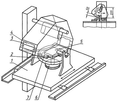 1 - подвижный стол; 2 - поворачивающийся диск; 3 - секторообразный груз; 4 - электрокорундовая шлифовальная шкурка; 5 - образец; 6 - храповой механизм; 7 - приспособление с упорами для закрепления образца