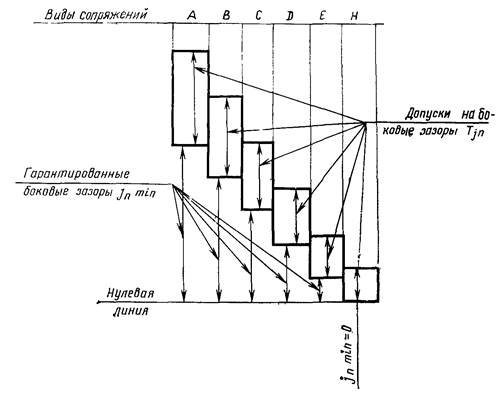 Гарантированный боковой зазор в каждом сопряжении обеспечивается при соблюдении предусмотренных классов отклонений межосевого расстояния (для сопряжений Н и Е - II класса, а для сопряжений D, С, В и А - классов III, IV, V и VI соответственно).