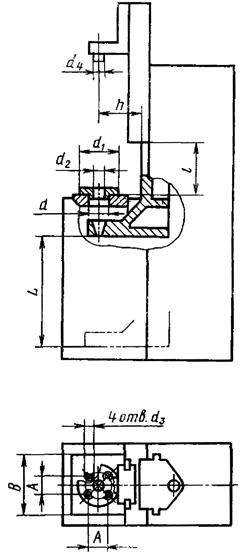 L - наибольшая длина хода рабочих салазок; В - рабочая ширина стола; h - расстояние от оси отверстия в столе до рабочих салазок или рабочих цилиндров; l - расстояние от плоскости стола до нижнего торца вспомогательных салазок; d - диаметр отверстия в столе под планшайбу; d1 - диаметр планшайбы; d2 - диаметр отверстия в планшайбе; А - расстояние между центрами резьбовых отверстий в столе для крепления планшайбы; d3 - диаметр резьбовых отверстий в столе для крепления планшайбы; d4 - центрирующий диаметр под вспомогательный патрон