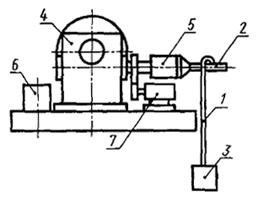 1 - образец провода; 2 - стержень; 3 - нагрузка; 4 - электродвигатель; 5 - вращающийся зажим; 6 - пусковое устройство; 7 - счетчик числа витков