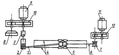 1 - образец провода; 2 - стержень; 3 - вращающийся зажим; 4 - направляющие; 5 - подвижная тележка с зажимом; 6 - натяжной трос; 7 - барабан; 8 - счетчик числа витков; 9 - электродвигатель намоточного устройства; 10 - редуктор намоточного устройства; 11 - электродвигатель натяжного устройства; 12 - редуктор натяжного устройства