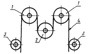 1 - подвижные стержни; 2 - неподвижные стержни; 3 - опорные ролики; 4 - испытуемый образец провода