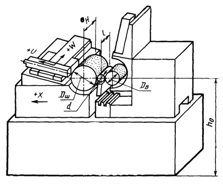 d - наибольший диаметр устанавливаемой заготовки; l - наибольшая длина шлифования врезанием; Н - наибольшая высота устанавливаемого круга; Dш - наибольший диаметр шлифовального круга; DB - наибольший диаметр ведущего круга; h0 - расстояние от основания до оси заготовки