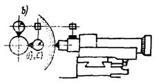 b) Проверка параллельности вертикальной поверхности относительно оси шпинделя ведущего круга или оси шлифовального шпинделя в горизонтально плоскости |