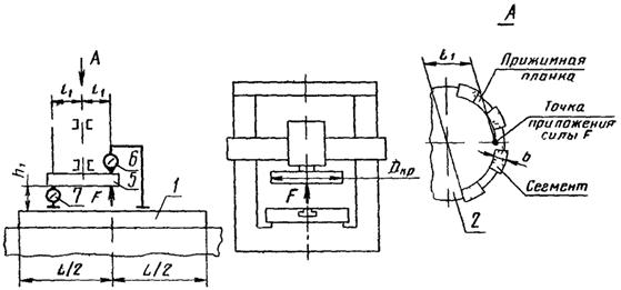 Относительное угловое перемещение под нагрузкой торца планшайбы круга и рабочей поверхности стола определяют отношением алгебраической разности показаний приборов 6 и 7 к расстоянию (в миллиметрах) между осями их измерительных наконечников (п. 3).
