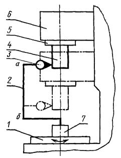 В базирующее отверстие шпинделя изделия или стола 1 устанавливают оправку 7, на которой укрепляют коленчатую отправку 2 с измерительным прибором 3 так, чтобы его измерительный наконечник касался цилиндрической поверхности контрольной оправки 4, плотно вставленной в коническое отверстие пиноли 5 контр-поддержки 6, и был направлен к ее оси перпендикулярно образующей.