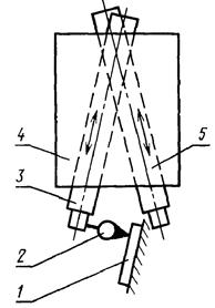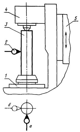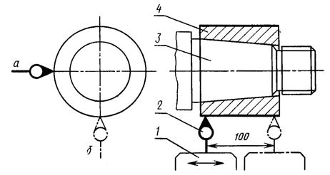 На шпинделе изделия или на столе 1 устанавливают регулируемую контрольную оправку 3 с цилиндрической рабочей частью так, чтобы смещение ее оси с осью вращения шпинделя изделия или стола было максимально возможным. Показывающий измерительный прибор 2 укрепляют так, чтобы его измерительный наконечник касался цилиндрической поверхности справки и был направлен к его оси перпендикулярно образующей. Второй аналогичный измерительный прибор укрепляют под 90° к первому.