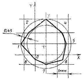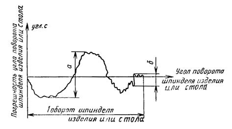 По значениям средних арифметических показаний измерительных приборов для каждого углового положения оси вращения шпинделя изделия (стола), строят график в прямоугольной системе координат (см. чертеж).
