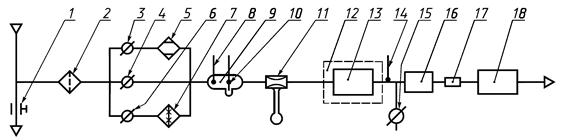 2.4. Проверяют герметичность установки: перекрывают краны и зажимы, сообщающие установку с атмосферой, а к крану 15 (для отбора пробы) присоединяют аспиратор.