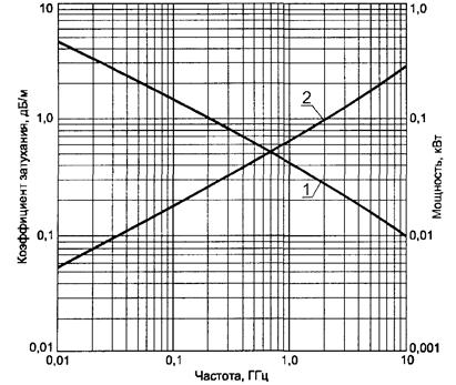 1 - допустимая мощность Р на входе при температуре 40 °С и коэффициенте стоячей волны напряжения, равном 1; 2 - коэффициент затухания a при температуре 20 °С