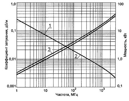 1 - допустимая мощность Р на входе при температуре 40 °С и коэффициенте стоячей волны напряжения, равном 1; 2 - коэффициент затухания α при температуре 20 °С; 3 - коэффициент затухания α при температуре 40 °С и максимальной допустимой мощности