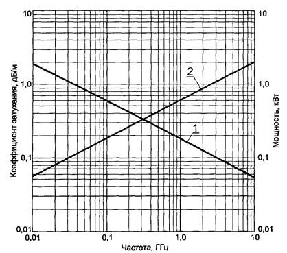 1 - допустимая мощность Р на входе при температуре 40 °С и коэффициенте стоячей волны напряжения, равном 1; 2 - коэффициент затухания α при температуре 20 °С