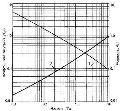 1 - допустимая мощность Р на входе при температуре 40 °С и коэффициенте стоячей волны напряжения, равном 1; 2 - коэффициент затухания α при температуре 20 °С
