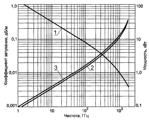 1 - допустимая мощность Р на входе при температуре 40 °С и коэффициенте стоячей волны напряжения, равном 1; 2 - коэффициент затухания a при температуре 20 °С; 3 - коэффициент затухания a при температуре 40 °С и максимальной допустимой мощности