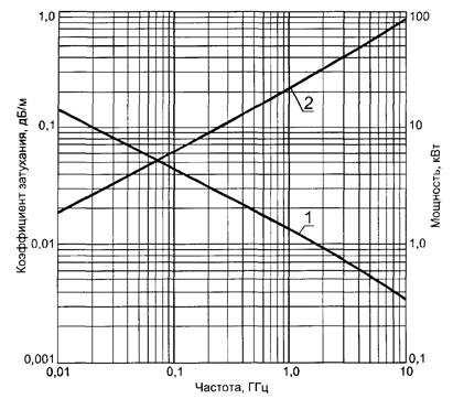 1 - допустимая мощность Р на входе при температуре 40 °С и коэффициенте стоячей волны напряжения, равном 1; 2 - коэффициент затухания α при температуре 20 °С