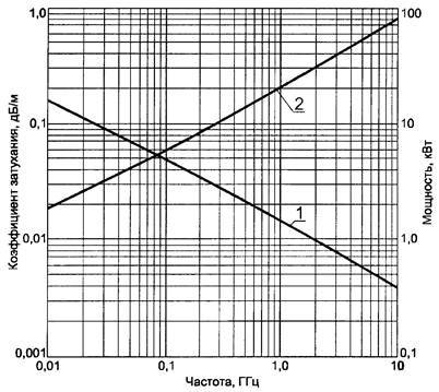1 - допустимая мощность Р на входе при температуре 40 °С и коэффициенте стоячей волны напряжения, равном 1; 2 - коэффициент затухания α при температуре 20 °С