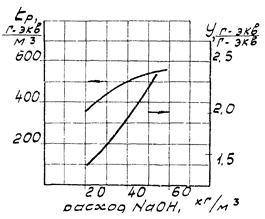 Черт. 2. Обменная емкость анионита АВ-17-8 и удельный расход гидроокиси натрия на регенерацию