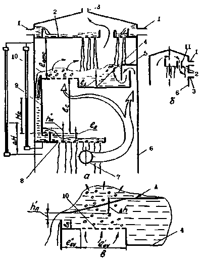 а - с центральным отводом выпара; б - с боковым отводом выпара; в - конструктивные параметры барботажного участка и его гидравлические характеристики; 1 - патрубок подвода деаэрируемой воды; 2 - верхний водораспределитель; 3 - патрубок отвода неконденсирующихся газов (выпара); 4 - поддон пароперепускного канала; 5 - колпак пароперепускного канала; 6 - корпус; 7 - подвод греющего пара; 8 - поддон водосливного стакана с нижним водораспределителем; 9 - стенка водосливного стакана; 10 - барботажный участок; 11 - вентиляционная труба; А - гипотетическая кривая гидростатического подпора на барботажном участке