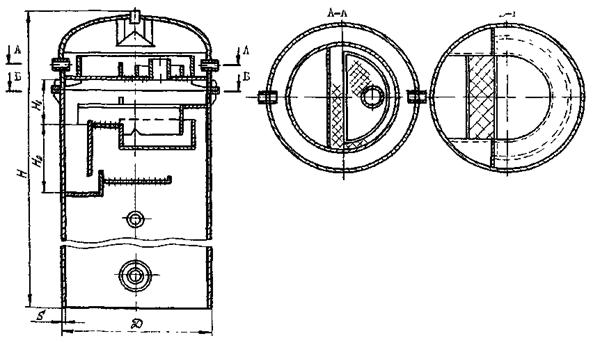 Водосливной стакан имеет малое гидравлическое сопротивление, поэтому высота столба воды в нем Нс, отсчитанная от кромки порога, практически равна сумме высоты слоя воды на этой кромке h’n и перепада давления на барботажном устройстве DH. Для создания надежного гидравлического затвора стенка относительно кромки порога должна быть заглублена на величину l2 = 0,02 - 0,04 м.