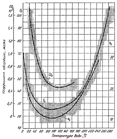 При температурах до 100 °С коэффициент Генри для растворов газов в воде возрастает с повышением температуры, что приводит к понижению растворимости компонента. При температурах выше 100 °С коэффициент Генри понижается, что приводит к повышению растворимости двухатомных газов в воде. Зависимости коэффициента абсорбции от температуры воды для кислорода, двуокиси углерода и азота приведены на рис. 1-1, значения этого коэффициента для кислорода - в табл. 1-1.