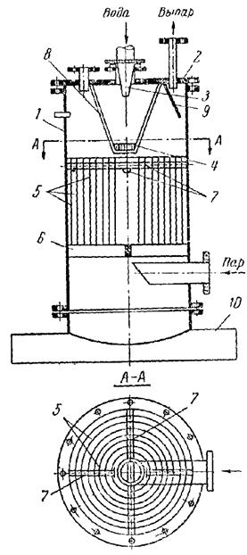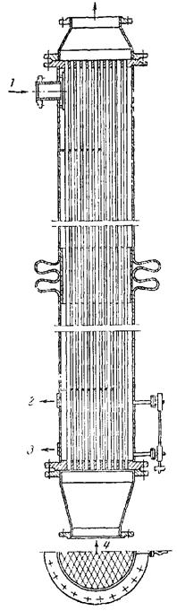 1 - выпар; 2 - воздух в смеси с несконденсировавшимся паром; 3 - конденсат пара из выпара; 4 - охлаждающий конденсат.