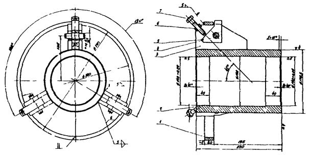 Приспособление имеет один индикатор R, ось которого перпендикулярна оси вала (для выявления радиальных смешений), и два диаметрально противоположных индикатора И1 и И2, оси которых параллельны оси вала (для выявления осевых отклонений - перекосов торцов полумуфт). Применение одного индикатора для выявления осевых отклонений недопустимо, так как при этом возможна значительная погрешность измерений. Индикаторы И1 и И2 установить на равных расстояниях от оси вала. Все три индикатора устанавливаются на валу механизма, а скобы для упора ножек индикаторов - на валу электродвигателя.