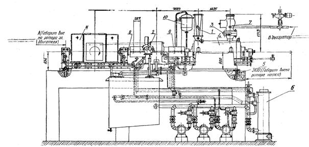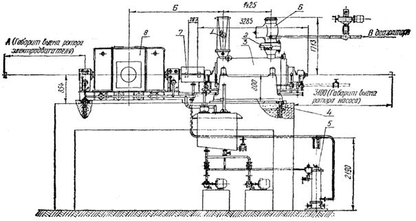 В соответствии с требованиями заказчика питательные насосные агрегаты для котлов с давлением пара 140 кгс/см2 поставляются заводом-изготовителем как с гидромуфтой (рис. 1), так и без гидромуфты (рис. 2). Установка насосного агрегата ПЭ270-150 дана на рис. 3.