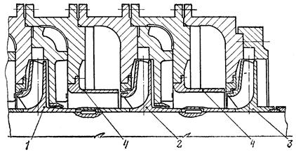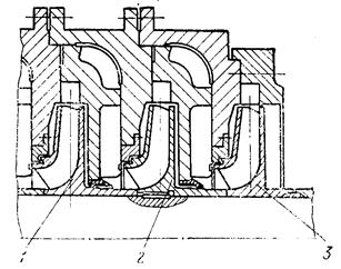 6.2.7. Для разборки внутреннего корпуса установить его вертикально в приспособлении для разборки (рис. 24). Разборку вести со стороны нагнетания, секции отжимать одна от другой при помощи отжимных винтов вместе с колесом.