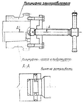 6.3.8. Собрать на насосе указатель осевого сдвига с упором ротора. Проверить совпадение риски на корпусе указателя с начальной риской на валу при упоре разгрузочного диска в подушку пяты. Проверить центровку роторов (см. раздел 4.4). Соединить полумуфты, собрать кожухи муфт и вспомогательные трубопроводы.