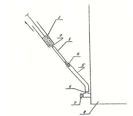 1) Медицинский шприц; 2) Шлиф шприца; 3) Резиновая трубка с внутренним диаметром 2 - 3 мм; 4) Переходник; 5) Трубка с внутренним диаметром 4 - 6 мм; 6) Штуцер; 7) Вентиль; 8) Бак трансформатора.