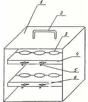 1) Корпус контейнера; 2) Ручка; 3) Гнездо для шприца; 4) Прижимная планка; 5) Винт; 6) Барашек.