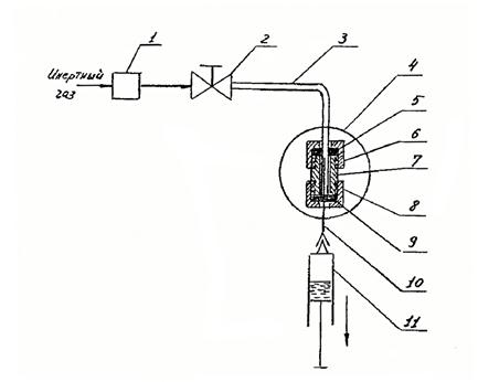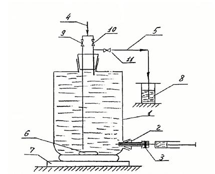 1) Сосуд; 2) Приспособление для ввода и отбора пробы масла; 3) Резиновая прокладка; 4) Трубка подвода газа-носителя; 5) Трубка вывода газа-носителя 6) Магнит; 7) Магнитная мешалка; 8) Масляный затвор; 9 - 11) Краны.