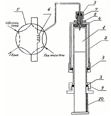 1) Шприц; 2) Рубашка шприца; 3) Резиновые уплотнения; 4) Эпоксидная смола; 5) Шестиходовой кран; 6) Дозирующая петля; 7, 9) Узлы герметизации; 8) Гайка; 10) Шаблон.