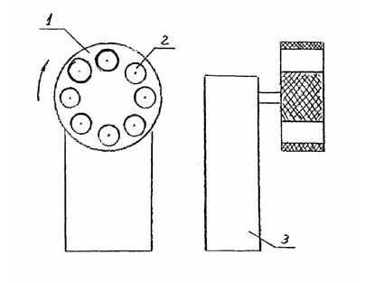 1) Барабан; 2) Ячейка для шприца; 3) Стойка с электроприводом барабана.