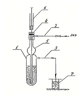 1) Сосуд с маслом; 2) Трубка подвода газа; 3) Трубка вывода газа; 4) Приспособление с резиновой прокладкой; 5) Расширитель; 6) Шприц; 7) Масляный затвор.