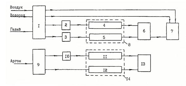 1) Блок подготовки газов хроматографа для анализа СО, СО2 и углеводородов; 2) Дозатор для анализа СО; 3) Дозатор для анализа СО2 и углеводородов; 4) Колонка для анализа СО; 5) Колонка для анализа СО2 и углеводородов; 6) ДТП хроматографа для анализа СО, СО2 и углеводородов; 7) ДИП того же хроматографа; 8) Термостат того же хроматографа; 9) Блок подготовки газов хроматографа для анализа Н2; 10) Дозатор для анализа Н2; 11) Колонка для анализа Н2; 12) Колонка сравнения для анализа Н2; 13) ДТП хроматографа для анализа Н2; 14) Термостат хроматографа для анализа Н2.