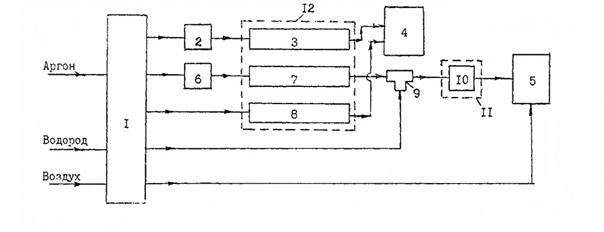 1) Блок подготовки газов хроматографа; 2) Дозатор для анализа Н2; 3) Колонка для анализа Н2; 4) ДТП; 5) ДИП; 6) Дозатор для анализе СО, СО2 и углеводородов; 7) Колонка для анализа СО, СО2 и углеводородов; 8) Колонка сравнения при анализе Н2; 9) Тройник; 10) Метанатогг; 11) Термостат метанатора; 12) Термостат хроматографа.