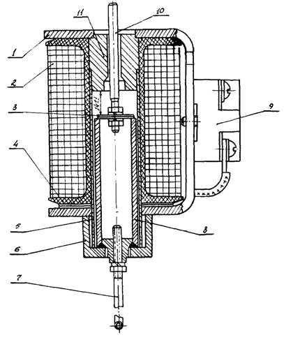 1 - карандаш; 2 - якорь; 3 - сердечник; 4 - корпус; 5 - пружинящая пластина; 6 - регулировочный винт; 7 - катушка