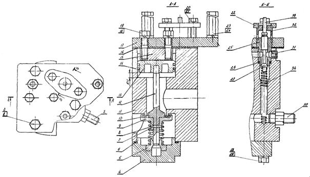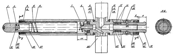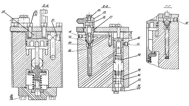 1, 22 - стойки; 2 - пробка; 3, 23 - шайбы пр. 12Н; 4 - болт М12×35; 5, 14, 25, 37 - крышки; 6, 10, 13, 38, 45 - прокладки; 7 - поршневое кольцо; 8, 26 - поршни; 9, 27 - корпусы; 11, 44 - клапаны; 12, 40, 43 - пружины; 15, 28 - втулки; 16 - штифт; 17 - специальный винт; 18 - гайка; 19, 24 - штоки; 20 - болт М8×35; 21, 3 - шайбы пр. 8Н; 24 - шток; 29 - болт М10×35; 30 - шайба пр. 10; 31, 32 - пробки; 33 - болт М10×40; 34 - шайба пр. 10Н; 35 - болт М8×25; 39 - вкладыш; 41, 46 - пробки; 42 - золотник.
