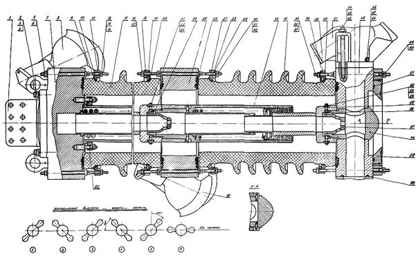 1, 6, 10, 17, 33, 42 - гайки; 2, 44, 49 - ниппеля; 3, 12, 13, 39, 53, 54 - корпусы; 4 - шарик; 5, 9, 32, 41 - шпильки; 7, 11, 15, 16, 24, 27, 34, 36, 43 - шайбы; 8 - фильтр; 14 - болт; 18, 29, 30, 63 - прокладки; 19, 31, 35, 40, 64 - крышки; 20, 26, 28 - втулки; 21, 38 - штоки; 22, 52 - пружины; 23, 37, 45, 46, 51 - клапаны; 25 - маховик; 47 - трубка; 48 - специальная гайка; 50 - штуцер; 55 - уплотнение; 56 - верхний фланец; 57 - медная трубка; 58 - войлок; 59 - металлическая сетка; 60 - пластинчатый бандаж; 61 - проволочный бандаж; 62 - нижний фланец
