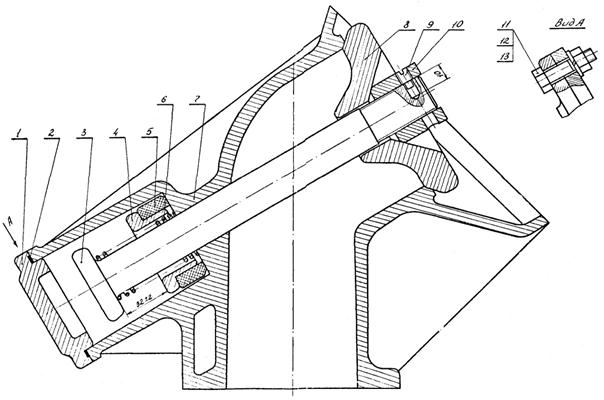 1 - болт М10×25; 2, 4 - шайбы пр. 10; 3 - болт М10×30; 5 - колпак; 6, 10, 12 - корпусы; 7 - подшипник; 8 - болт М8×20; 9 - вал; 11 - ниппель; 13, 17 - пружины; 14 - направляющая; 15 - гайка М12; 16 - болт М12×40; 18 - втулка; 19 - обойма; 20 - прокладка; 21 - поршень; 22 - поршневое кольцо; 23 - шайба пр. 8