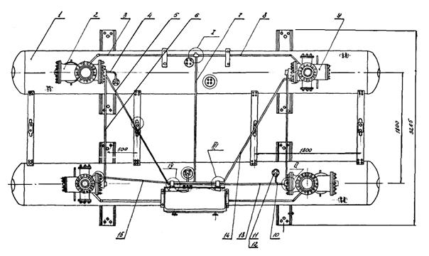 1, 12, 14, 15, 19 - трубки; 2, 4 - болты М8; 3 - фланец; 5 - редукторный клапан; 6 - промежуточное реле; 7 - манометр; 8 - кнопочное устройство; 9 - входной вентиль; 10 - обратный клапан; 11 - болт М10; 13, 18 - трубки местного пневматического управления; 16 - фильтр; 17 - блок пневматических клапанов
