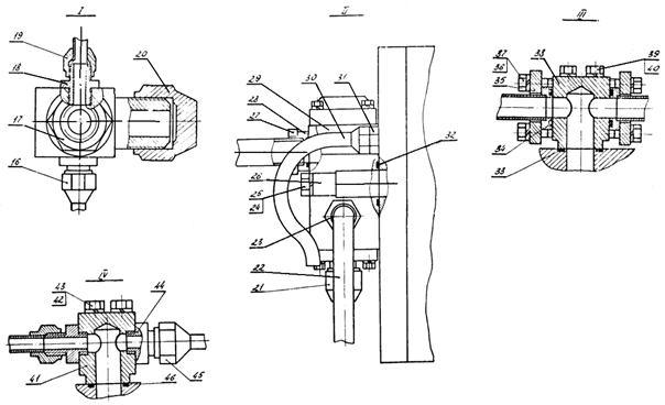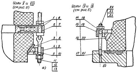 1, 3, 6, 8, 16, 17, 20, 21 - уплотнения; 2, 7 - плиты; 4, 9, 15, 19 - нажимные кольца; 5, 10, 14, 18 - разъемные кольца; 11, 22 - шпильки М10; 12, 23 - гайки М10; 13, 24 - шайбы пр. 10; 17, 21 - уплотнения; узлы V и IV - узлы опоры камеры (позиции указаны слева); узлы VIII и IX - узлы опоры отделителя (позиции указаны справа).