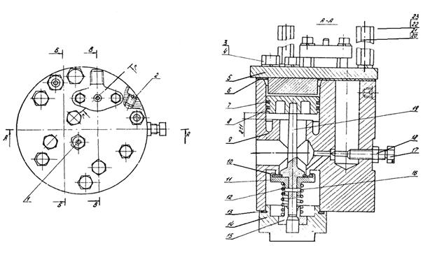 1, 16 - ниппеля; 2 - фильтр; 3 - клапан; 4, 13, 19 - корпусы; 7, 11 - болты; 8 - гайка; 9 - верхний упор; 10, 23 - пружины; 12 - шайба; 14 - прокладка; 15 - подогреватель; 17 - сетка фильтра; 18 - грубый фильтр; 20, 22 - штоки; 21 - шарик