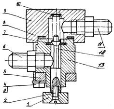 1 - кнопка; 2 - винт; 3 - болт; 4 - шайба; 5 - крышка; 6, 11 - ниппеля; 7 - шайба; 8 - прокладка; 9, 13 - корпусы; 10 - пружина; 12 - клапан