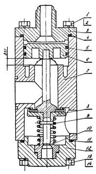 1, 13 - болты М8×25; 2, 14 - шайбы пр. 8Н; 3, 12 - крышки; 4, 11 - уплотнения; 5 - поршневое кольцо; 6 - поршень; 7 - корпус; 8 - клапан; 9 - пружина; 10 - втулка