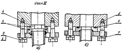 а - с дросселем; б - без дросселя; 1 - болт М12×50; 2, 7 - шайбы пр. 12; 3, 6 - уплотнительные шайбы; 4 - дроссельная шайба; 5 - болт М12×45